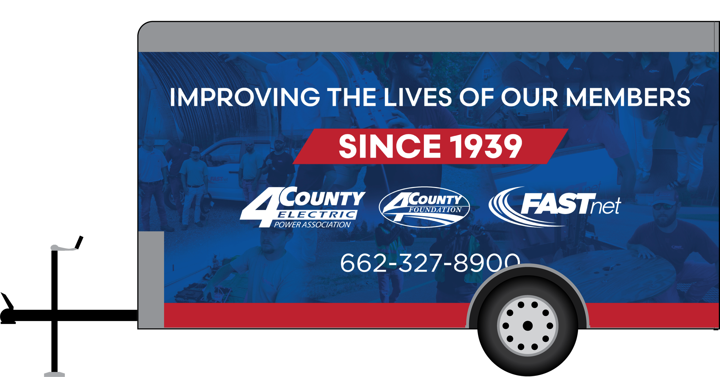 Designed and produced a full trailer wrap for 4 County Electric Power Association, showcasing their family of brands: 4 County Electric, 4 County Foundation, and FASTnet. The wrap features a bold blue photo collage of lineworkers and community moments, reinforcing their legacy of service since 1939. The tagline "Improving the Lives of Our Members" anchors the design, paired with clear branding and contact information for maximum visibility on the road.